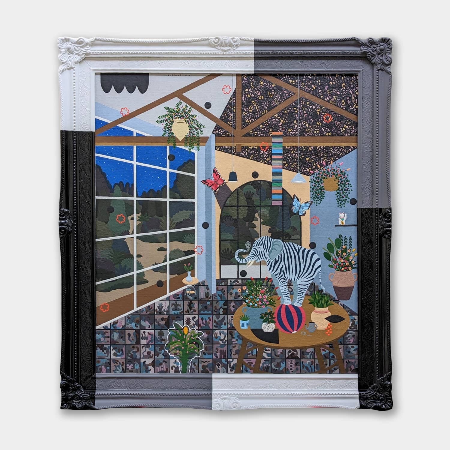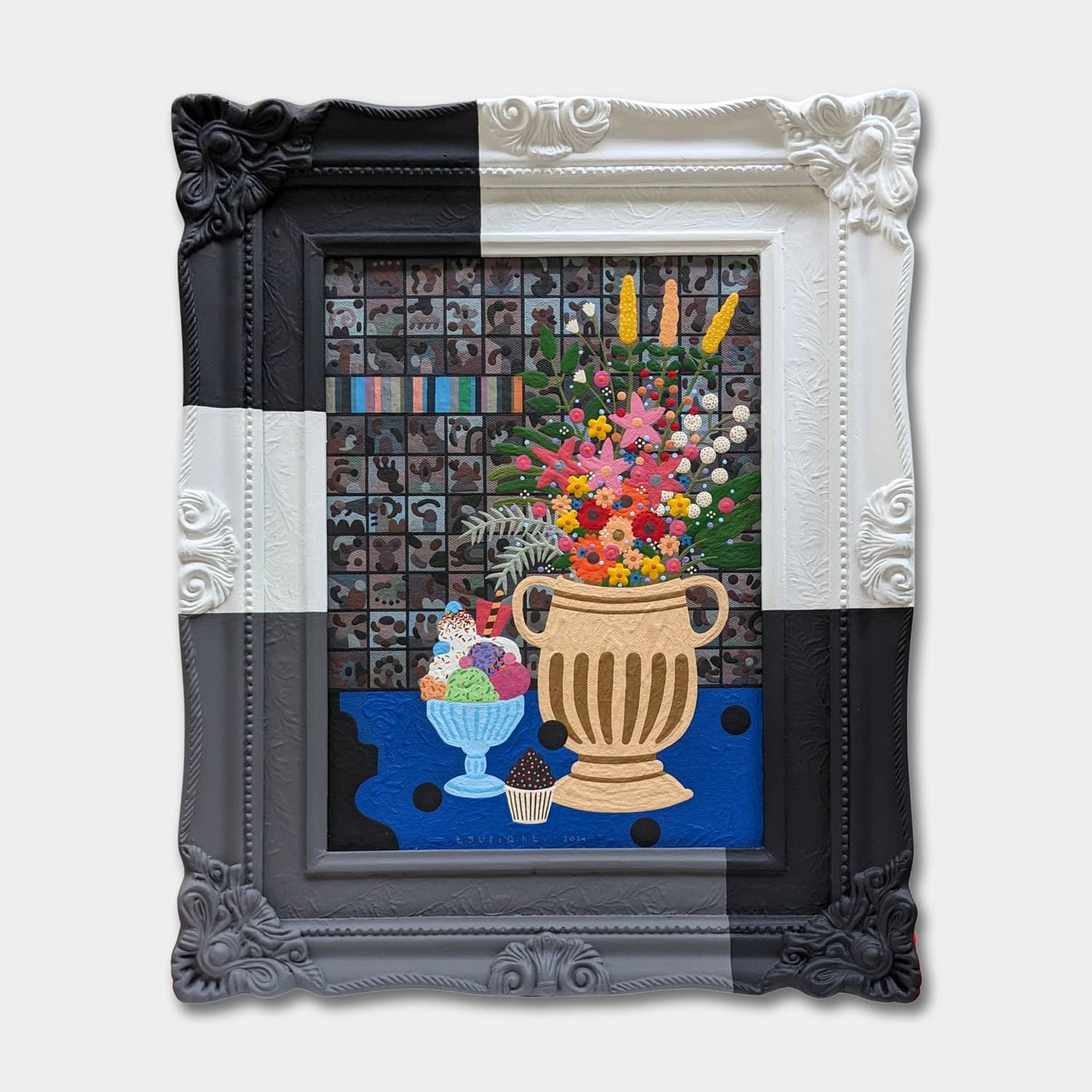Acrylic on canvas, painted wood frame
